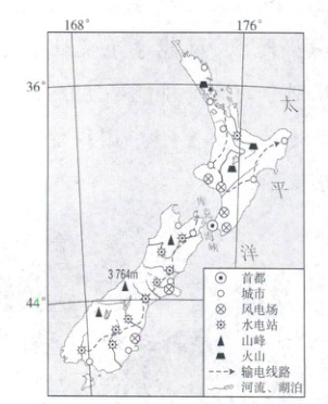 (2025河北石家庄检测)某年7月,新西兰国有输电网运营商发表的一份报告发现显示,随着分布式电池储能的广泛使用以及电池技术的进步,未来屋顶光伏发电的比重还会增加。虽然光伏发电暂时还未列入可再生能源电力统计中,但全国可再生能源电力在发电总量中的占比仍超过了90%。下图示意新西兰风力及水力发电设施分布。读图,回答18~20题。