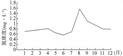 (2025 黑龙江哈尔滨练习) 氮浓度是反映湖泊、水库水体富营养化程度的重要指标之一。江苏省沙河水库是太湖流域上游丘陵地区的一座大型水库,每年 7~8 月氮浓度超过环保标准,水体富营养化突出。下图示意沙河水库氮浓度的年变化。读图,回答 3~4 题。