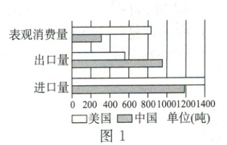 (2025 浙江台州质检)钽是重要的工业原料,钽矿产量主要来自非洲,我国钽资源对外依存度超过 90%。从钽资源生产与消费状况看,我国与美国等发达国家分属钽产业链不同环节,目前我国进口大多为钽矿资源以及钽电容器等,而出口则以钽粉、未锻轧钽等产品为主。下图 1 为 2015~2022 年美国和中国年均钽资源表观消费量(产量与净进口量之和)、进出口量对比,图 2 为钽产业链示意图。读图,回答 3~5 题。