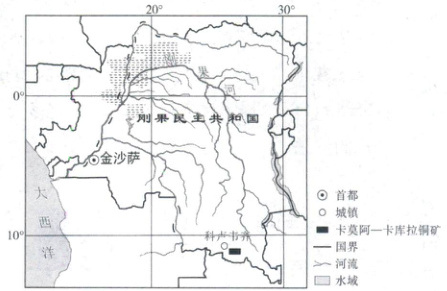 矿采掘为主。2015年,我国某企业与该国合作,部分收购卡莫阿—卡库拉铜矿进行开采与冶炼,并在矿区为其配建水电站。从一期项目开始,我国企业将“中国技术、中国标准、中国方案”全方位引入施工现场,刷新了当时该国矿山建成投产的最快记录。下图示意卡莫阿—卡库拉铜矿的位置。