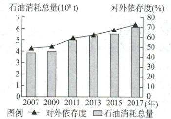 (2021 浙江 6 月选考)下图为我国 2007~2017 年石油消耗总量和对外依存度(石油净进口量/石油消耗总量×100%)统计图。读图,回答 1~2 题。