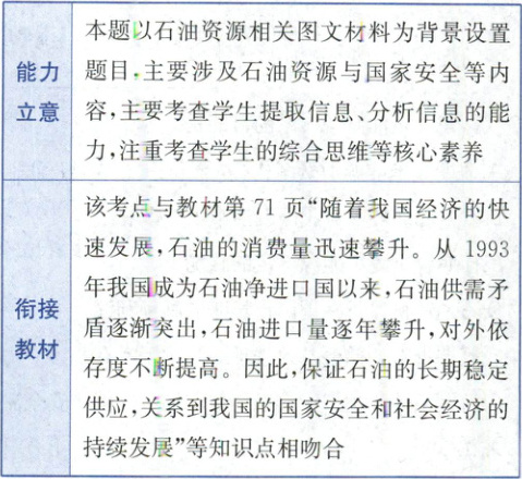 1.C 2.A 解析:1.长江三角洲地区经济发达,劳动力成本和地价成本都高,人工成本高,A项错误;首批4个国家石油储备基地都位于沿海,交通都便利,B项错误;长江三角洲地区经济发达,能源需求量大,市场需求大是主要考虑因素,C项正确;由材料“其储备的石油主要来源于中东地区、拉丁美洲和俄罗斯,且以中东地区为主”可知,距产地远,D项错误。2.岙山油库可与相距不远的镇海油库实现管网互联,这样做是为了调配库存,保证市场供应,A项正确;二者市场都是面向长江三角洲,两地管网互联不能扩大市场,B项错误;管网互联,能通过管道调配石油库存,与增加就业机会无关,C项错误;油价主要是由国际市场调控的,二者管网互联达不到控制油价的作用,D项错误。