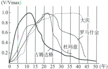 (2025 福建三明练习)下图表示中国的大庆油田、俄罗斯的罗马什金油田、杜玛兹油田和土库曼斯坦的古姆达格油田采油速度与最大采油速度之间的比值随投产时间的变化曲线图(比值为“1”时,即达到“巅峰时刻”)。读图,回答 1~2 题。