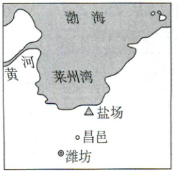 (2025 重庆练习)每年 5 月,昌邑北部渤海沿岸的盐田便会迎来春盐收获季,当地在盐田布局风力发电设备,获得了较好的效益。下图为昌邑盐场位置图。读图,回答 1~2 题。