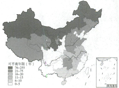 例1 “占一补一、占优补优”,是《土地管理法》规定的国家实行占用耕地补偿制度的基本原则。耕地占补平衡制度是坚守18亿亩耕地红线的重要举措。下图为我国可实现耕地占补平衡年限(即可平衡年限)的空间分布图。读图,回答(1)~(2)题。