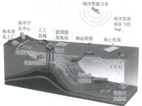 (2)海运、海港、围海造陆、海上航空线、跨海大桥、人工岛、海上石油平台、海底隧道、海底城市、海洋旅游、海水淡化、网箱养殖等。