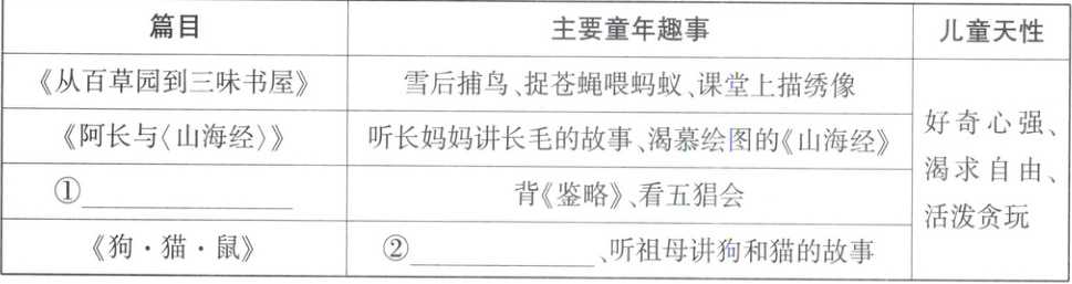 1. 下面是某同学在梳理鲁迅的童年趣事时制作的读书卡,请你补写完整。(2分)