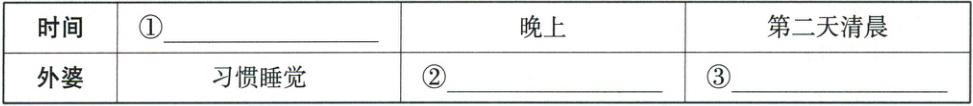 1. 【记事要有条理】作者巧妙地运用具体事件生动地勾勒出外婆的形象。班级同学做了以下梳理,请你站在外婆的视角,按时间顺序梳理外婆的故事。(3分)