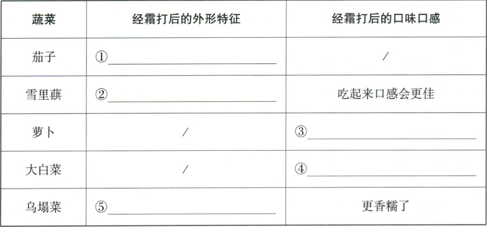 1. 文章写到了多种经霜打后的蔬菜。请结合文章内容,填写下列表格。(5分)
