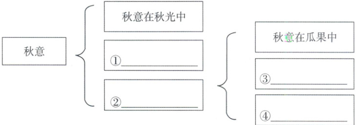 1. ①秋意在古城里 ②秋意在山野中 ③秋意在草木中(秋意在植物里) ④秋意在夜色中