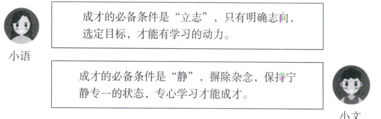 ③他们两个观点不全面。成才的条件不是单一的,要同时具备三个:①立志,“非淡泊无以明志,非宁静无以致远”“非学无以广才,非志无以成学”;②学习,“夫学须静也,才须学也”;③惜时,“年与时驰,意与日去,遂成枯落,多不接世,悲守穷庐,将复何及”。这三者是互相联系、缺一不可的。(4分)