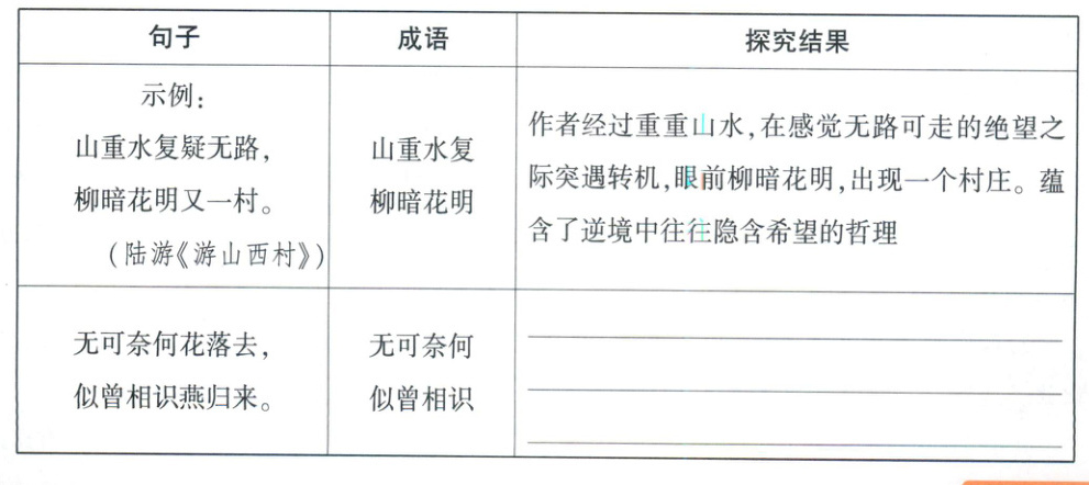 1. 小宁想结合诗歌中的成语和作者的心理活动探究诗歌蕴含的哲理,下面是她的学习笔记,请你帮助补全表格中的内容。(2分)