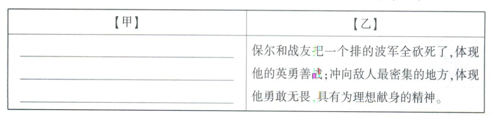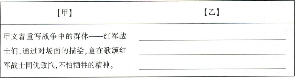 二、(10分) ① 甲:红军英勇地夺下了泸定桥,取得了长征中又一次决定性的胜利。 乙:主人公头部受到重创,右眼失明。(2分) 2 红军最后夺下碉堡,胜利渡河,体现了他们的英勇善战;红军攀着铁索,冒着枪林弹雨,体现了他们勇敢无畏。他们具有为理想献身的精神。 (3分) 3乙文着重写战争中的个体——保尔,通过对保尔动作心理等细节的描写,目的在于塑造保尔勇敢无畏的英雄形象。(2分) 4 示例:说他是人:保尔有普通人的情感与弱点,会因战友牺牲痛苦,因伤病陷入挣扎,也有对爱情的憧憬与迷茫,是有血有肉、经历成长阵痛的凡人。 说他是疯子:为革命,他不惜以命相搏,重伤后仍奔赴前线;全身瘫痪、失明,还用写作战斗,对信仰的执着近乎疯狂,不顾自身安危与苦难。 说他是神:保尔历经无数磨难,却始终以钢铁意志战胜一切,从战场到病榻,用行动诠释信仰的力量,成为鼓舞众人的精神图腾,其坚韧与奉献远超常人,如“神”般照亮理想之路。 (3分)