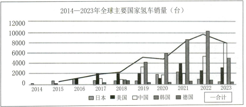 2. 近十年来世界氢能源车的销量呈递增趋势,2023 年除初中国以外,其他国家出现下滑态势。(2 分)