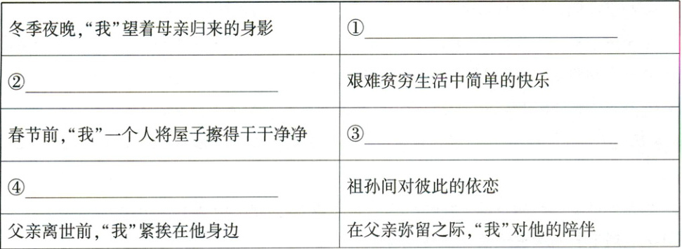 1. 本文通过回忆往事,表达了对温馨的理解。请结合文章,补全下面表格的相关内容。(4分)
