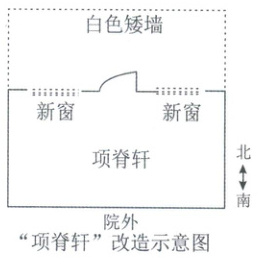 4. 明代散文家归有光的书斋“项脊轩”坐南朝北,阳光无法照射进屋内,导致屋内采光很差。于是他在北墙上开了四扇窗子,又修了几面白色矮墙围起庭院。一番改造后,屋内变得明亮起来。请观察示意图,结合文章及小贴士,说明“项脊轩”内变明亮的原因。(2分)