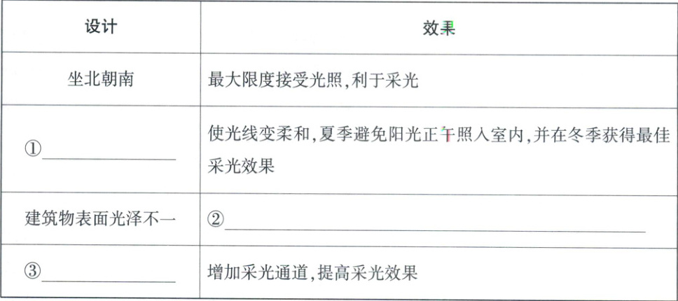 3. 读完本文,小语觉得紫禁城建筑的采光设计很巧妙,于是梳理了具体设计及其效果,请你帮她补充完成下面表格。(3分)