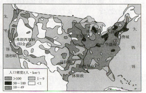 (1)指出美国人口的分布特点,分析东北部人口稠密的原因。
