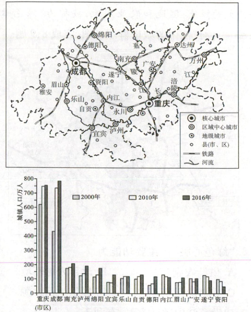 [2022·河北唐山第一中学高一期中]城市群一般是以经济比较发达、具有较强辐射带动作用的核心城市为中心,由若干个空间邻近、联系密切、功能互补和等级有序的周边城市共同组成。成渝城市群地处我国西南腹地,下面两图分别是成渝城市群空间结构规划略图与2000年、2010年和2016年成渝城市群部分城市的城镇人口统计图。据此完成17~19题。