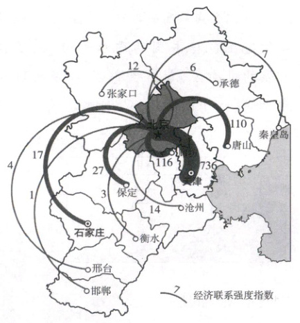 [2022·陕西西工大附中高一期中]下图是京津冀各城市与北京经济联系指数图,图中指数越大,表示城市之间经济流量越大。据此完成20、21题。