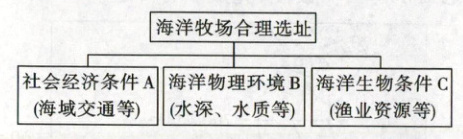 [2022·江西新余一中高一期中]海洋牧场是指在一个特定的海域里,为了有计划地培育和管理渔业资源而设置的人工渔场。下图为影响海洋牧场选址条件结构图,下表为我国东海海域四地的选址条件对比表(数值为某一条件的影响系数,数值越大表明该条件越优)。据此完成 14、15 题。