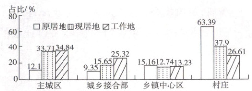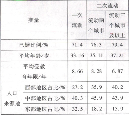 18.C【解析】分析表中数据可知,二次流动的人口中已婚比例更高,平均年龄更大,据此可以推测其更多地考虑子女入学、照顾老人等家庭因素,C项正确。由表可知,二次流动的劳动力平均受教育年限较低,且年龄偏大,在劳动力市场上不具备优势,更多的是从较高等级城市向较低等级城市流动,所以不是考虑收入水平和公共服务水平,A、B项错误。现阶段环境因素并不是影响我国人口迁移的主要因素,D项错误。