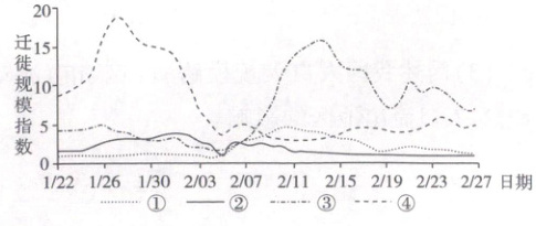 21.B【解析】由材料“迁徙规模指数甲市小于乙市”可知,图中曲线①②为甲市,③④为乙市。根据材料信息“乙市制造业发达,吸引甲市大量人口赴乙市务工”可知,②应表示春节前甲市的人口主要为流入,④表示春节前乙市的人口主要为流出,①表示春节后甲市的人口主要为流出,③则表示春节后乙市的人口主要为流入,②③符合题目要求,B项正确。