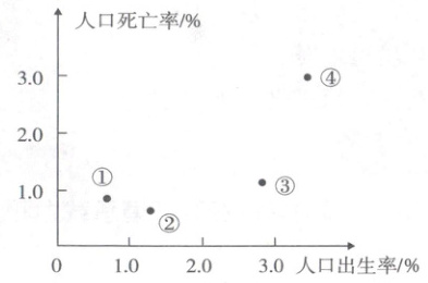 下图表示四个国家的人口出生率和死亡率。读图,完成 1~3 题。