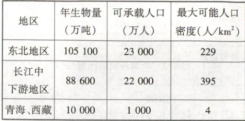 7.D [解析]与青海、西藏地区相比,东北地区距海较近,A项错误。读表可知,东北地区最大可能人口密度没有长江中下游地区高,B、C项错误。东北地区年生物量最丰富,资源环境所能承载的人口最多,D项正确。