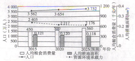 16.C [解析]由图可知,2015—2025年山西省资源环境承载力在减小。图中人口数量的增加幅度较小,且人口数量不直接影响资源环境承载力,A项错误。科学技术的进步会增大资源环境承载力,B项错误。由图可知,2015—2025年山西省人均粮食消费量在提高,人均消费水平与资源环境承载力呈负相关,C项正确。读图可知,2015年山西省总人口为3562万人,人均耕地面积为0.121公顷,耕地总面积为0.121×3562 = 431020公顷;2025年,山西省总人口为3732万人,人均耕地面积为0.118公顷,耕地总面积为0.118×3732 = 4403760公顷;2015—2025年山西省土地资源总量增加,D项错误。
