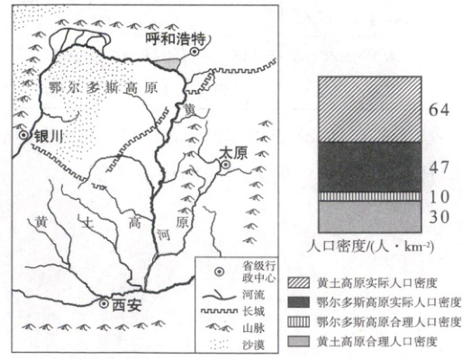 易错规避 本题学生容易误选A项,误认为鄂尔多斯高原煤炭、天然气等矿产资源丰富,靠近宁夏平原和河套平原灌溉农业区,自然条件优越,区域资源环境承载力大。解题关键:紧扣图中有效信息“鄂尔多斯高原合理人口密度是10人/平方千米,实际人口密度是47人/平方千米”,实际人口密度远远大于其合理人口密度,资源短缺、环境污染、生态破坏等环境问题突出,B项正确。区域资源环境承载力的大小受自然资源数量和质量、社会经济和科技发展水平、人均消费水平等因素的影响和制约,图中显示鄂尔多斯高原沙漠面积大,说明当地水资源少,区域资源环境承载力小,由此排除A项。