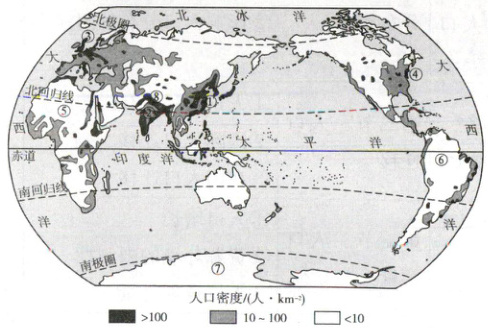 5.C [解析]从图中可知,世界人口分布沿海多于内陆、亚洲多于欧洲、中低纬度多于高纬度,A、B、D项错误。东半球为20°W向东到160°E的区域,人口多于西半球,C项正确。
