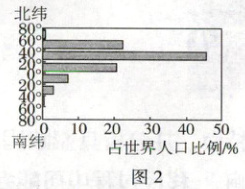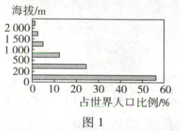 [2022·山东临沂高二期末]读世界不同海拔人口分布示意图(图 1)和世界不同纬度人口分布示意图(图 2),完成 1、2 题。