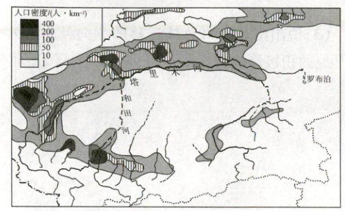 (1)读图可知,南疆人口主要沿河流和山麓绿洲分布,这些地带水源充足,地形平坦开阔,土壤肥沃,发展农业生产的条件优越。