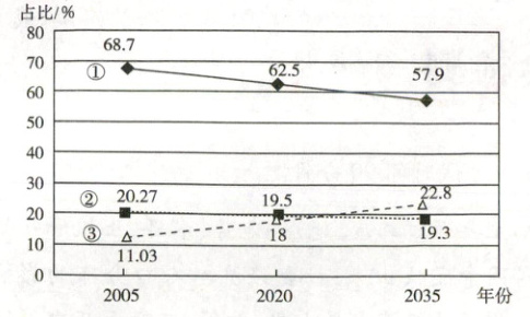 [2022·江苏泰州高三期末]题图为我国 0~14 岁、15~59 岁、60 岁及以上三个年龄段人口结构变化统计图(含预测)。据此完成 6、7 题。