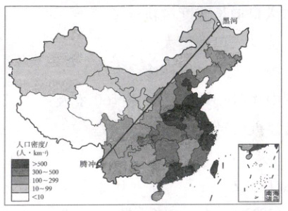 [2022·江苏淮安高中校协作体高一期中]人口分布是指人口在一定时间内的空间存在形式、分布状况。影响人口分布的因素有自然环境因素和社会经济因素。自然环境对人口分布的影响主要通过纬度、地形、地势、水源、土壤和气候等因素反映出来;社会经济对人口分布的影响主要通过经济发展水平、政策、交通和历史等因素反映出来。下图为 2010 年中国人口分布图。