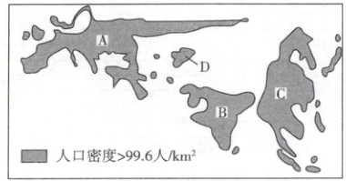 )①D 处深居内陆,环境承载力小,难以形成大面积人口稠密区 ②D 处地处沿海,炎热干燥,人烟稀少 ③D 处利用高山冰雪融水发展绿洲农业,形成人口稠密区 ④D 处高温多雨,环境承载力大,形成人口稠密的孤岛