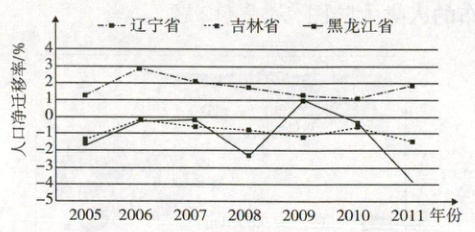 [2022·四川成都高二联考]人口净迁移率是指一个地区在一定时期内迁入人口数与迁出人口数的差额占总人口的百分比。下图表示 2005—2011 年东北三省人口净迁移率。据此完成 11~13 题。