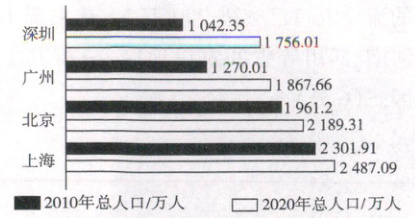[2022·广东汕头高一期中]题图示意 2010—2020 年北京、上海、深圳、广州的城市人口数量变化情况。图中显示过去十年我国人口向北京、上海、深圳、广州进一步聚集。据此完成 14~16 题。