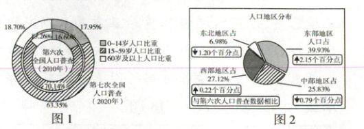 (1)读图可知,第六次全国人口普查中0~14岁人口占16.60%,15~59岁人口占70.14%,60岁及以上人口占13.26%;第七次全国人口普查中,0~14岁人口占17.95%,15~59岁人口占63.35%,60岁及以上人口占18.70%。由此可知,老年人口和少年儿童人口比例都显著增加,青壮年人口比例减少。带来的影响是劳动人口所占比重减少;人口老龄化严重,社会养老保障系统负担过重;老年人口和青少年人口增加,青壮年负担过重。