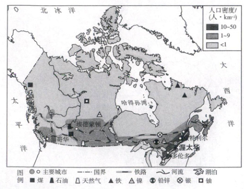 [2022·湖北武汉高一期中]加拿大的人口主要为英、法移民后裔。2020 年人口数量为 3 800 万,人口增长速度达 1.1%,人均 GDP 超过 4 万美元,城镇人口比重为 81.6%。下图示意加拿大人口密度分布。据此完成 9、10 题。