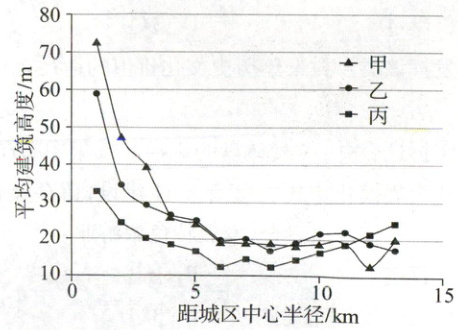 8.D【解析】读图可知,甲土地利用类型在市中心的平均建筑高度最高,由市中心向外平均建筑高度迅速递减,因此甲为商业用地;乙土地利用类型的平均建筑高度在市中心较高,在距城区中心半径为4~12千米处基本超过甲土地利用类型,高于丙土地利用类型,因此乙应是居住用地;丙土地利用类型的平均建筑高度在距市中心12千米以外超过甲、乙土地利用类型,主要为工业用地;行政文教用地平均建筑高度整体较低,在一般城市中区位分布没有固定的区位要求,受地租因素影响较小,因此甲、乙、丙均不是行政文教用地。综上所述,D项正确。