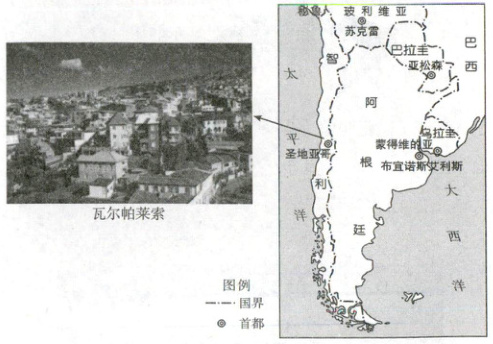 [2022·湖北武汉高一期中] 瓦尔帕莱索位于智利首都以西 130 千米,位于瓦尔帕莱索湾南岸,有智利“文化之都”的美誉,是南美洲太平洋东岸的重要海港城市,因海洋而兴,因运河而衰,现处于“一带一路”节点,再度繁荣。这里属地中海气候。过去,修船工将修船剩下的油漆调成各种颜色涂在自己房屋上,这种习俗就一直延续到城市的建筑风貌上。下图为智利示意图和瓦尔帕莱索景观图。据此完成 11~13 题。
