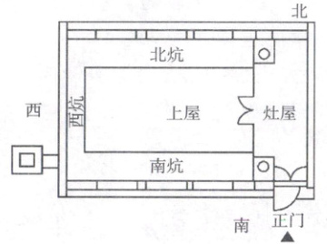 [2022·广东汕头高一期中] “口袋房,万字炕,烟囱出在地面上”形象地说出了我国东北满族传统民居的特征。早期的“口袋房”屋顶用桦树皮或茅草覆盖,甚至墙壁也多用树干加工后排列“砌”成;多间北房在最东一间开门,房屋形似口袋;其北屋内南、西、北三面筑有“匚”字形大土坯炕,叫作“万字炕”。下图为满族传统民居平面示意图。据此完成 14、15 题。