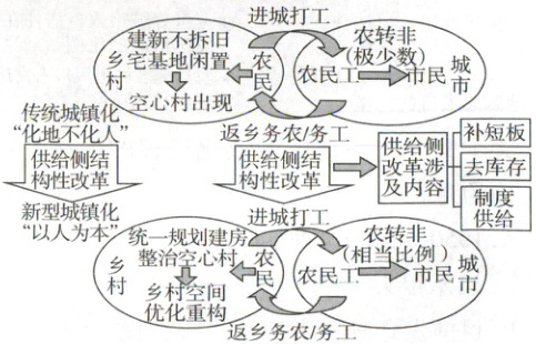 19.D 【解析】由图示信息可知,供给侧结构性改革使相当比例的农民工农转非,完善了城市社会保障体制,避免产生社会治安问题,这是对城市的积极影响,A、B项错误。乡村空间优化,统一规划建房,有利于改善乡村居民的生存环境,C项错误,D项正确。