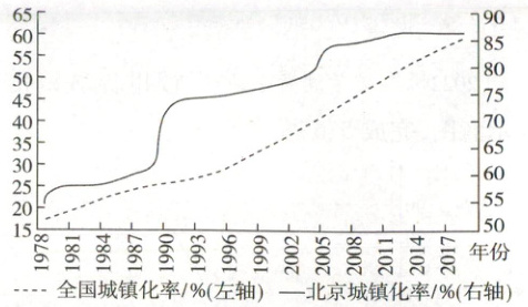 [2022·河南高一联考] 题图示意 1978 年以来全国和北京城镇化率变化。据此完成 15、16 题。
