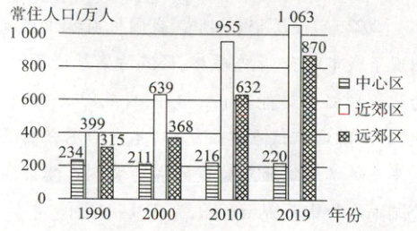 )A. 1990—2010 年近郊区人口增速最大