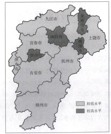 (2) 差异:城镇化水平总体北部高,南部低。原因:江西省南部为山区,城镇化发展条件差;江西省北部以平原为主,城市发展条件较优越。