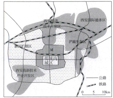 (3)高新技术产业开发区和经济技术开发区以工业生产为主,属于工业用地,且对环境质量要求高。读图可知,二者分别位于西安市西南郊区和北部郊区,地处城市外围,地价低,且发展空间大;临近城外公路、铁路等快速交通干线,交通便利。