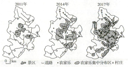 [2021·河北卷]我国东部某山区有一 AAAAA 级景区,2011—2017 年游客数量持续增加,景区周边农家乐数量逐年增多,分布范围不断扩大。如图示意 2011 年、2014 年和 2017 年景区周边农家乐的空间分布。据此完成 4、5 题。